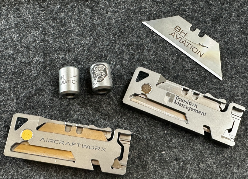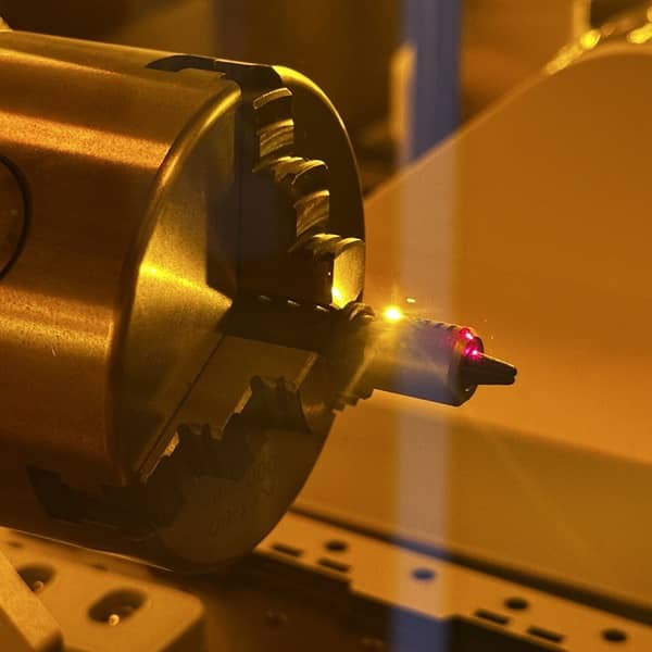 We laser each bead, blade and frame using our 100W fiber laser equipped with a rotary attachment. We don’t engrave, we oxidize. By focusing a tightly controlled beam of light onto the surface, we selectively heat the titanium just enough to create an oxide layer, resulting in a clean, durable mark.